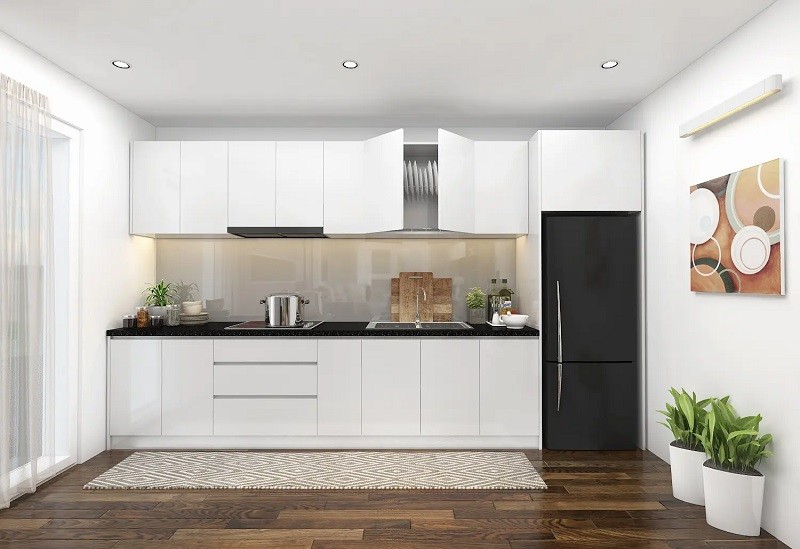 Mẫu tủ bếp này giúp tiết kiệm diện tích tối đa, lý tưởng cho căn hộ chung cư nhỏ hoặc nhà ống có chiều ngang hẹp. Thiết kế này mang lại vẻ ngoài gọn gàng, liền mạch và dễ dàng vệ sinh.